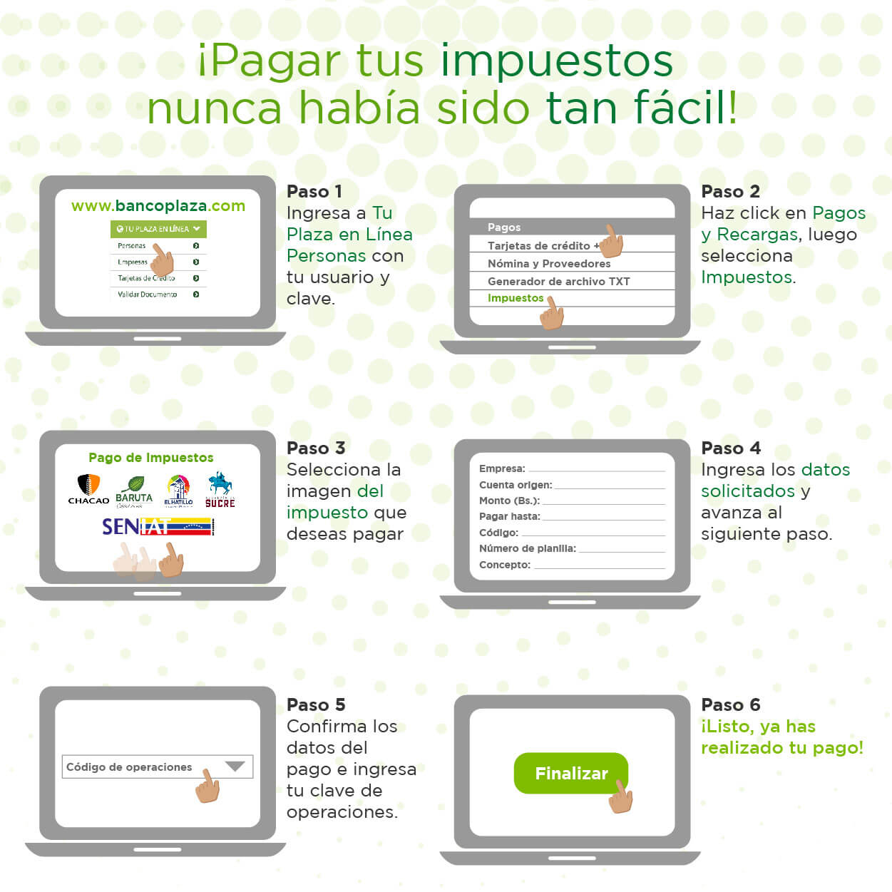 Realiza el pago de tus impuestos al SENIAT y a las Alcaldías de Chacao, Baruta, El Hatillo y Sucre desde donde quiera que estés, a través de Tu Plaza en Línea Empresas de 5:00 a.m. a las 10:00 p.m. los 365 días del año.