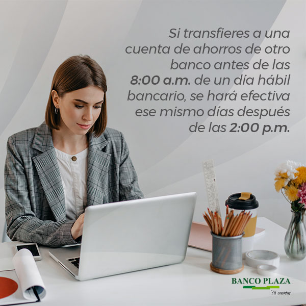 - Realiza tus transacciones financieras a cualquier hora, durante los 365 días del año, a través de tus Canales y Servicios Plaza.